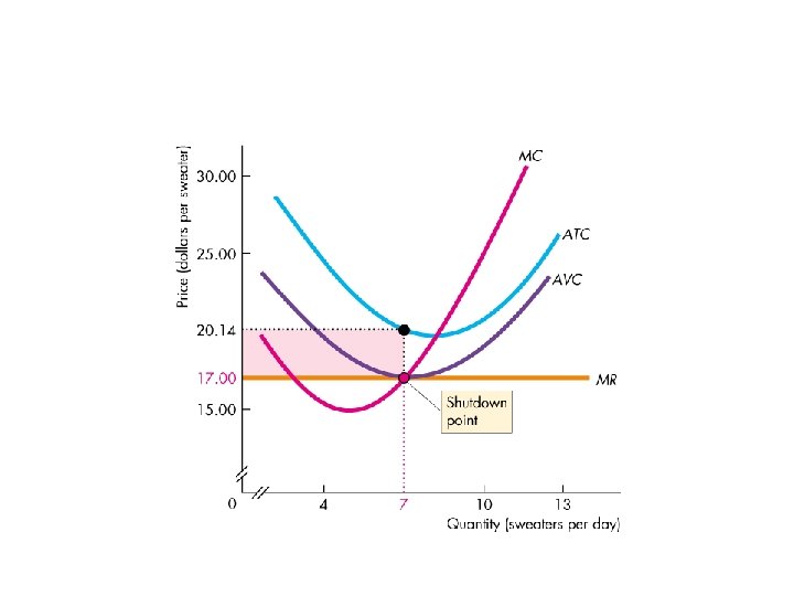 *Last graph shows the shutdown point. Minimum AVC is $17 a sweater. If the price is $17, the profit-maximizing output is 7 sweaters a day. The firm incurs a loss equal to the red rectangle.