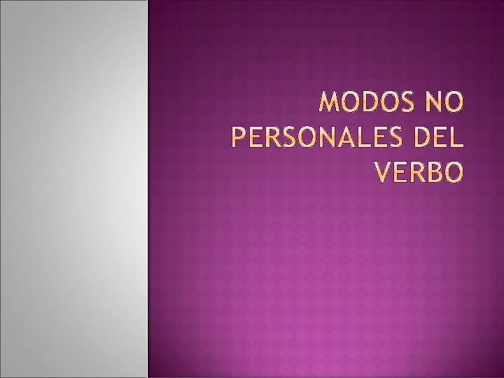 Las formas no personales del verbo son aquellas que no admiten ningún pronombre personal (yo, tú, él, nosotros, vosotros o ellos) como sujeto. INFINITIVO (-AR, -ER, IR). Simple CANT-AR , BEB-ER, RE-ÍR Compuesto GERUNDIO (-ANDO, IENDO) HABER CANTADO Simple AM-ANDO, BEB-IENDO Compuesto HABIENDO AMADO PARTICIPIO (-ADO, -IDO, SO, -TO, -CHO) CALLADO, IMPRESO. SALIDO, VISTO, HECHO,
