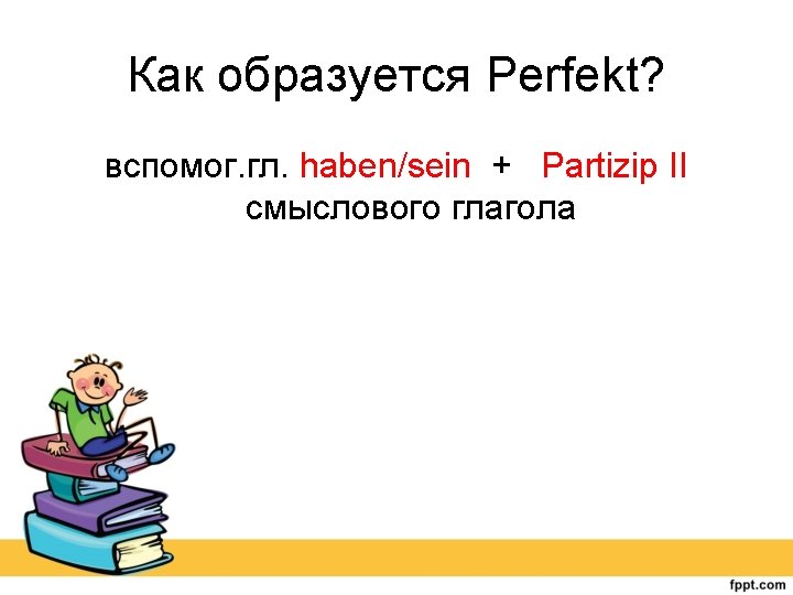 Вспомогательные глаголы занимают второе место в предложении haben sein ich habe bin du hast bist er, sie, es hat ist wir haben sind ihr habt seid Sie, sie haben sind