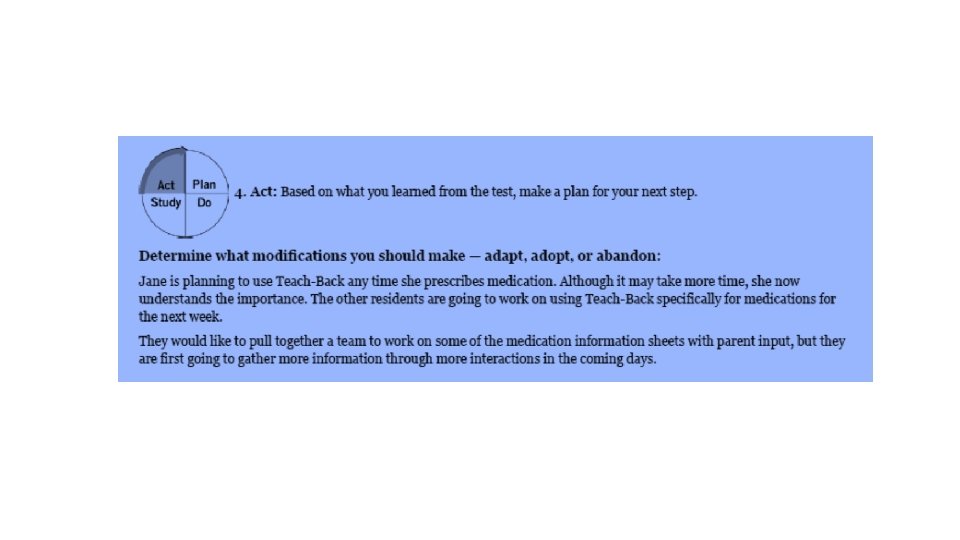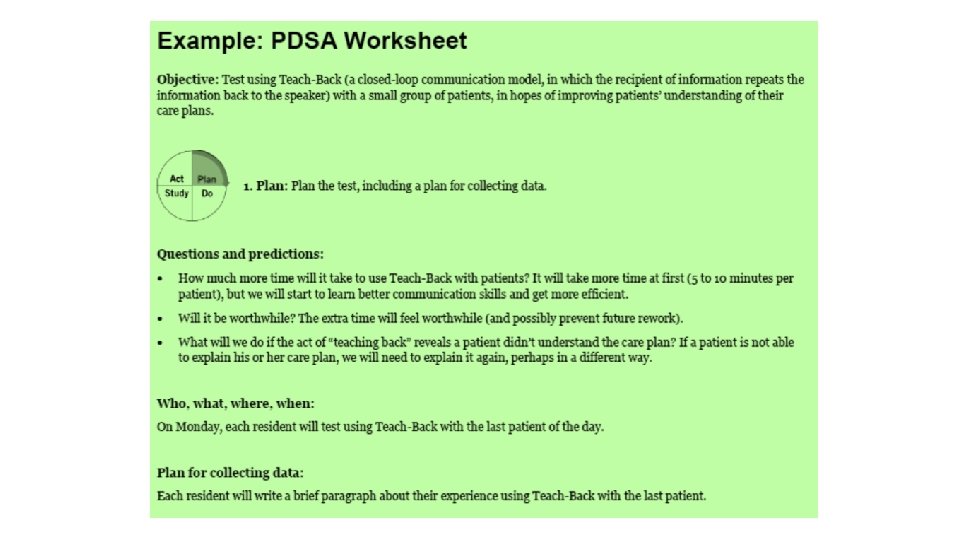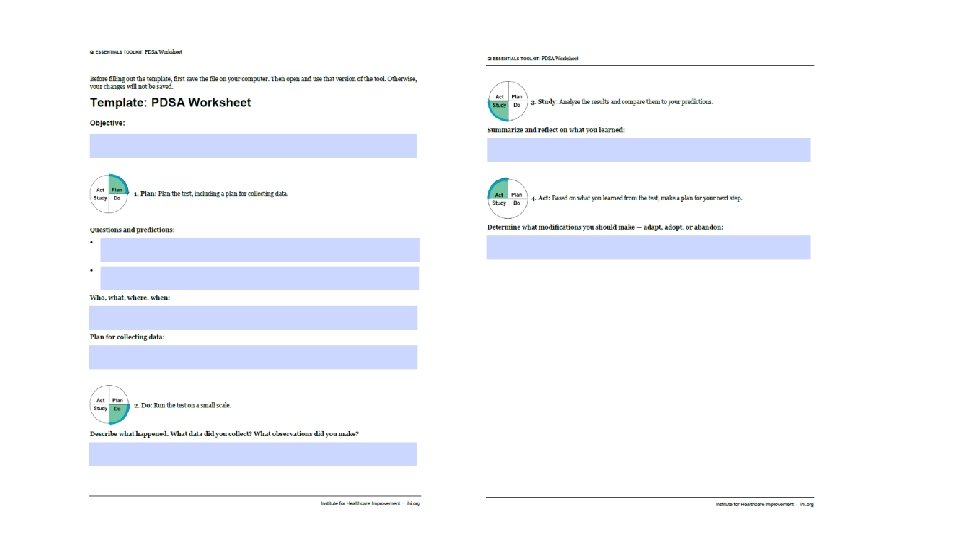 Plan – Do – Study – Act (PDSA Worksheet) • The Plan-Do-Study-Act (PDSA) cycle is a useful tool for documenting a test of change. Running a PDSA cycle is another way of saying testing a change —you develop a plan to test the change (Plan), carry out the test (Do), observe, analyze, and learn from the test (Study), and determine what modifications, if any, to make for the next cycle (Act). • Fill out one PDSA worksheet for each change you test. In most improvement projects, teams will test several different changes, and each change may go through several PDSA cycles as you continue to learn. Keep a file (either electronic or hard copy) of all PDSA cycles for all the changes your team tests.