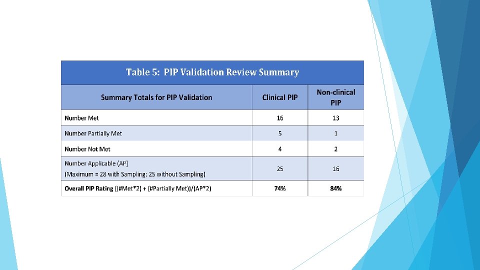 PIP Scoring Met Partially Met Not Met Each MET element = 2 points Each PARTIALLY MET element = 1 point The MET and Partially MET elements are divided by the Total Applicable Elements to. 44