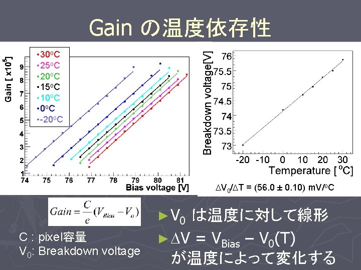 Gain result Pedestal peak 25 o. C で測定 1 p. e. peak d 2 p. e. peak … S : ADCの分解能 = 0. 25 p. C/ADCcount A : Amp gain = 63 e : 素電荷 = 1. 6 x 10 -19 C C : pixel容量 V 0: Breakdown voltage