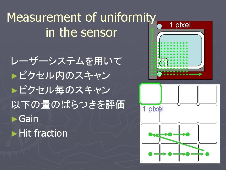 Uniformity within a Pixel - Gain Vbias = 70. 0 V y-point (1 m pitch) Edge of the sensor x 105 x-point (1 m pitch) • ピクセルの中央は高いgain • 有感領域内でのばらつき ~ 2. 7 % (RMS)