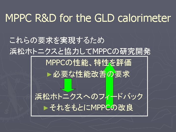 GLD (Global Large Detector) Calorimeter § カロリメータ内での 粒子の識別が要求される Electro-magnetic Calorimeter tungsten plate § 微細な分割が必要 § 膨大なチャンネル数 ~10 Mchannel § 強磁場中で使用 PMTに代わる新しい 光検出器としてMPPC 1 cm x 4. 5 cm x 3 mm particles readout by MPPC