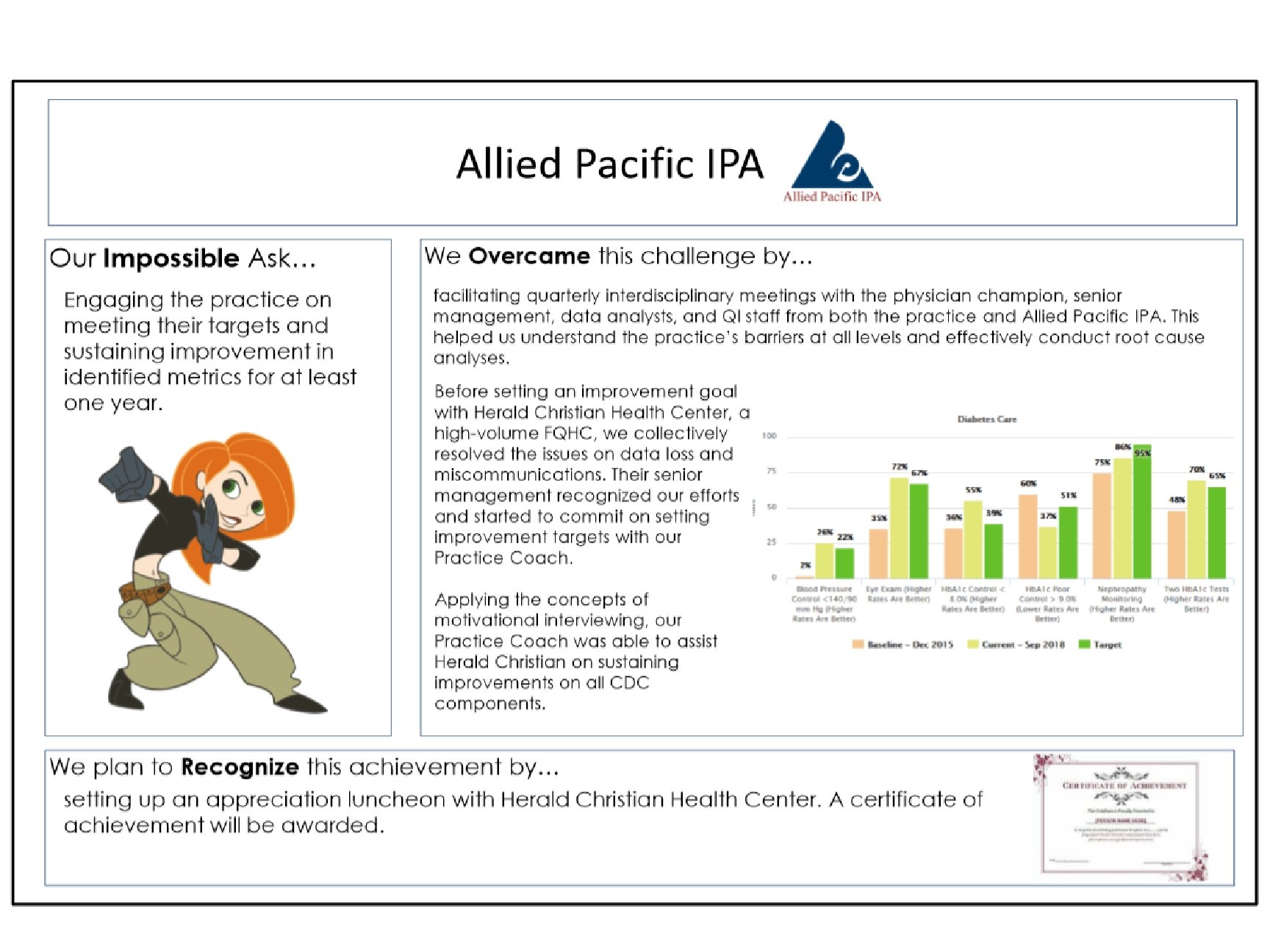 Your Organization’s Name and Logo Our Impossible Ask… 3 – 4 sentences describing the most significant challenge you faced working with your practices at the beginning of PTI We Overcame this challenge by… 2 – 4 paragraphs describing what steps you took to overcome this challenge. Reflect on your efforts by providing an example of your achievements with a single practice We plan to Recognize this achievement by… Identify what steps you’ve taken, or plan to take, to recognize the achievements of your practice(s).