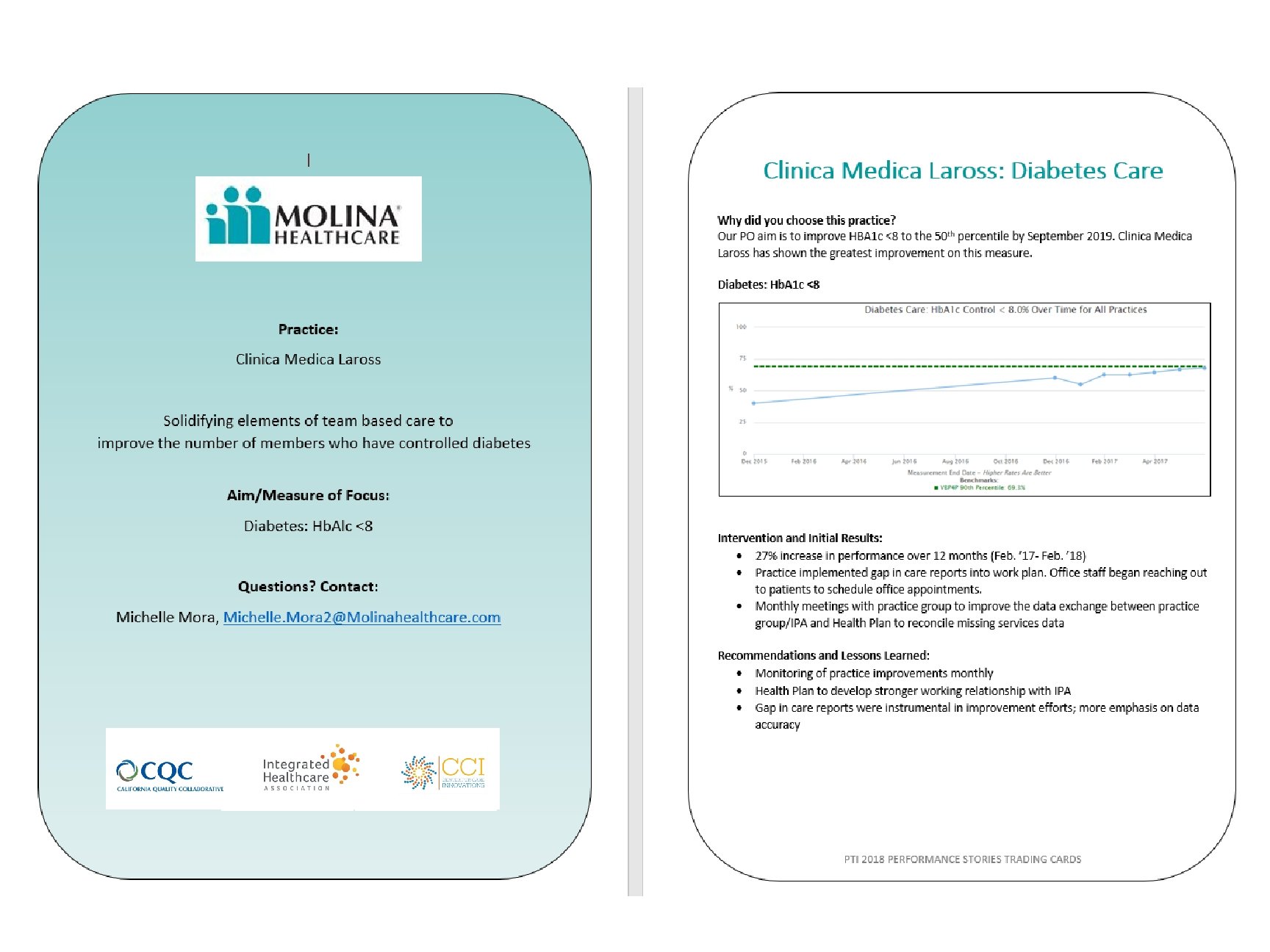 PTI 2018 PERFORMANCE STORIES What this conversation taught us… Interview summary: “It’s an amazing feeling to be a part of a team that is transforming care to a new level. Patients are creating their own ‘patient-to-peer’ support system. ” - Angela Histo, Medical Assistant • PAMF is a participant in the CMS program Million Hearts. Cardiovascular Disease Risk Reduction Model. PAMF developed an organizational program to focus on population health management through shared medical appointments. • Santa Clara Internal Medicine of the 12 pilot sites for SMA (shared medical appointment) visits. • Content of SMA consists of Cardiovascular Disease Education, shared decision making and patient individualized action planning. • SMA Team consists of: Internal Medicine Physician Medical Assistants and a Patient Service Representative. Medical 2 presentation and Assistants take vitals, drive technology scribe sessions live during the group visit. Patient Service Representative greets patients in the lobby, checks in patients and escorts them to the conference room. • Outreach and patient education is key to patient engagement for the sessions. About the practice: “CVD is a topic close to my heart. It changes medicine from a provider giving direction, to the transfer of ideas from one patient to another on lifestyle changes and putting their care in their own hands. ” - Vidhi Shah, M. D. Internal Medicine “I think group interaction of this type is quite effective. When we commit to others, it becomes more important to what we’ve said we would do. ” - Patient Survey Comment