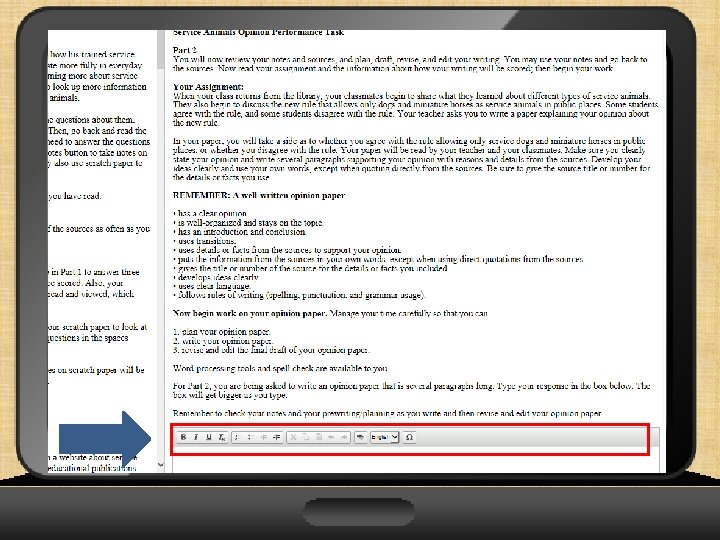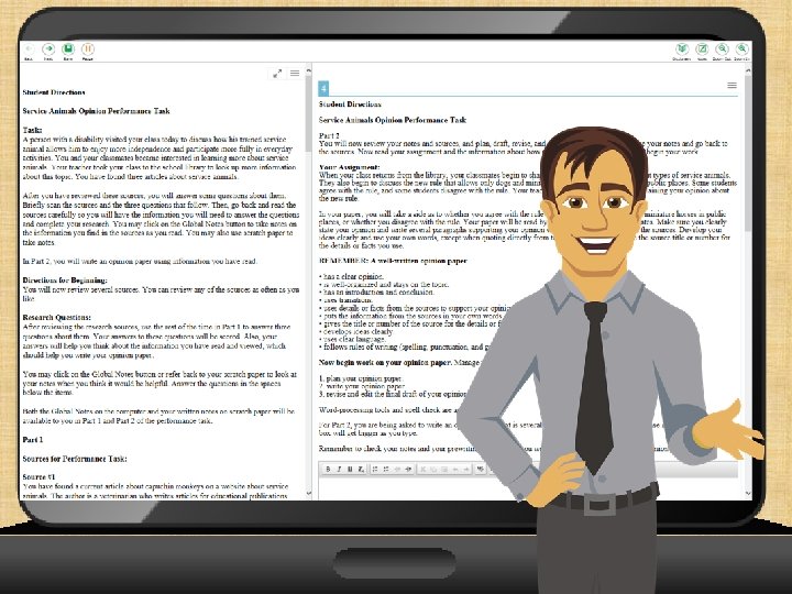 ELA Performance Task Example: In this example, students access research articles from several sources about the same topic — in this case, how service animals help people. Notes can be taken on paper or on the computer.