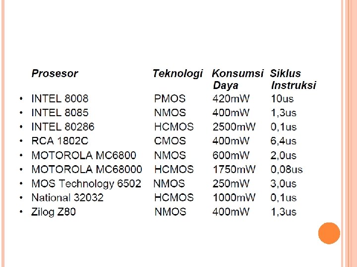 BERDASARKAN TEKNOLOGI BAHAN Mikroprosesor dan keluarga komponen sejenis seperti memori dan rangkaian I/O dibuat dengan berbagai teknologi bahan. Beberapa dari teknologi tersebut adalah : � TTL (Transistor-transistor Logic) � STTL (Schottky-clamped TTL) � LSTTL ( Low Power STTL) � ECL (Emitter Coupled Logic) � IIL (Integrated-injection Logic) � PMOS (P-Channel Metal Oxide Semiconductor) � NMOS (N-Channel Metal Oxide Semiconductor) � CMOS (Complementary MOS) � HSCMOS (High Speed CMOS)