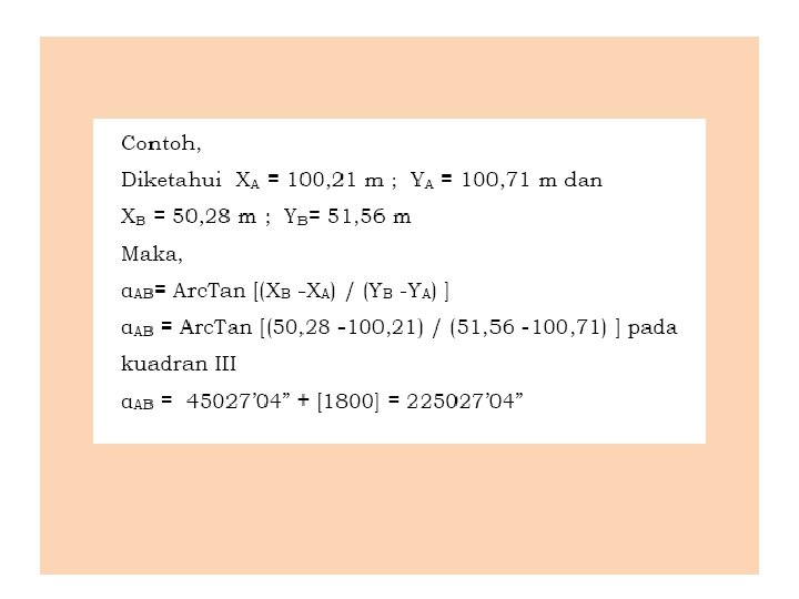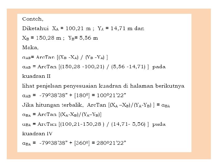 Hitungan Arc. Tan (α) bisa bernilai negatif atau positif. Jika positif, azimut terletak di kuadran I atau III. Azimut terletak di kuadaran I jika (XB -XA) > 0 dan (YB -YA) > 0; hasil hitungannya ditambahkan 0⁰. Azimut terletak di kuadaran III jika (XB -XA) <0 dan (YB YA) < 0; hasil hitungannya ditambahkan 180⁰. Jika negatif, azimut terletak di kuadran II atau IV. Azimut terletak di kuadaran II jika (XB -XA) > 0 dan (YB YA) < 0; hasil hitungannya ditambahkan 180⁰ Azimut terletak di kuadaran IV jika (XB -XA) <0 dan (YB YA) > 0; hasil hitungannya ditambahkan 360⁰.