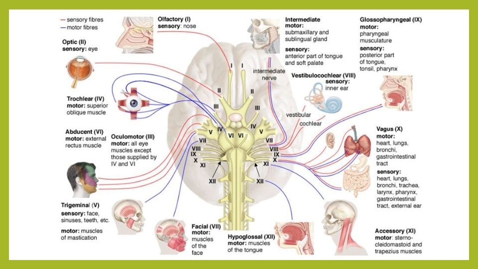 MOŽDANI ŽIVCI I n. olfactorius (njušni živac) II n. opticus (vidni živac) III n. oculomotorius (okulomotorni živac) VIII n. vestibulocochlearis (slušni živac) IX n. glossopharyngeus (jezičnoždrijelni živac) IV n. trochlearis (trohlearni živac) X n. vagus (lutajući živac) V n. trigeminus (trodjelni živac) XI n. accesorius (akcesorni živac) XII n. hypoglossus (podjezični VI n. abducens (abducentni živac) VII n. facialis (lični živac)