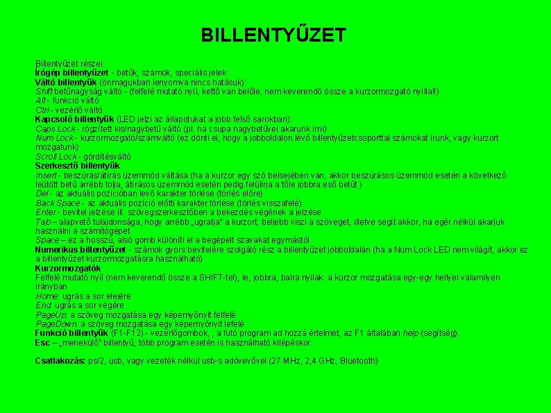 BILLENTYŰZET Billentyűzet részei: Írógép billentyűzet - betűk, számok, speciális jelek Váltó billentyűk (önmagukban lenyomva nincs hatásuk): Shift betűnagyság váltó - (felfelé mutató nyíl, kettő van belőle, nem keverendő össze a kurzormozgató nyíllal!) Alt - funkció váltó Ctrl - vezérlő váltó Kapcsoló billentyűk (LED jelzi az állapotukat a jobb felső sarokban): Caps Lock - rögzített kis/nagybetű váltó (pl. ha csupa nagybetűvel akarunk írni) Num Lock - kurzormozgató/számváltó (ez dönti el, hogy a jobboldalon lévő billentyűzetcsoporttal számokat írunk, vagy kurzort mozgatunk) Scroll Lock - gördítésváltó Szerkesztő billentyűk Insert - beszúrás/átírás üzemmód váltása (ha a kurzor egy szó belsejében van, akkor beszúrásos üzemmód esetén a következő leütött betű arrébb tolja, átírásos üzemmód esetén pedig felülírja a tőle jobbra eső betűt ) Del - az aktuális pozícióban levő karakter törlése (törlés előre) Back Space - az aktuális pozíció előtti karakter törlése (törlés visszafelé) Enter - bevitel jelzése ill. szövegszerkesztőben a bekezdés végének a jelzése Tab – alapvető tulajdonsága, hogy arrébb „ugratja” a kurzort, beljebb viszi a szöveget, illetve segít akkor, ha egér nélkül akarjuk használni a számítógépet Space – ez a hosszú, alsó gomb különíti el a begépelt szavakat egymástól Numerikus billentyűzet - számok gyors bevitelére szolgáló rész a billentyűzet jobboldalán (ha a Num Lock LED nem világít, akkor ez a billentyűzet kurzormozgatásra használható) Kurzormozgatók Felfelé mutató nyíl (nem keverendő össze a SHIFT-tel), le, jobbra, balra nyilak: a kurzor mozgatása egy-egy hellyel valamilyen irányban Home: ugrás a sor elejére End: ugrás a sor végére Page. Up: a szöveg mozgatása egy képernyőnyit felfelé Page. Down: a szöveg mozgatása egy képernyőnyit lefelé Funkció billentyűk (F 1 -F 12) - vezérlőgombok, , a futó program ad hozzá értelmet, az F 1 általában help (segítség). Esc – „menekülő” billentyű, több program esetén is használható kilépéskor. Csatlakozás: ps/2, usb, vagy vezeték nélkül usb-s adóvevővel (27 MHz, 2, 4 GHz, Bluetooth)