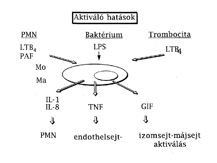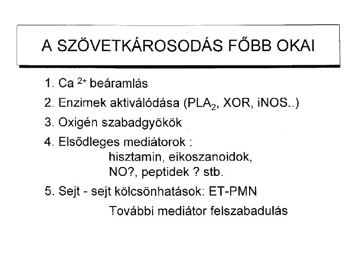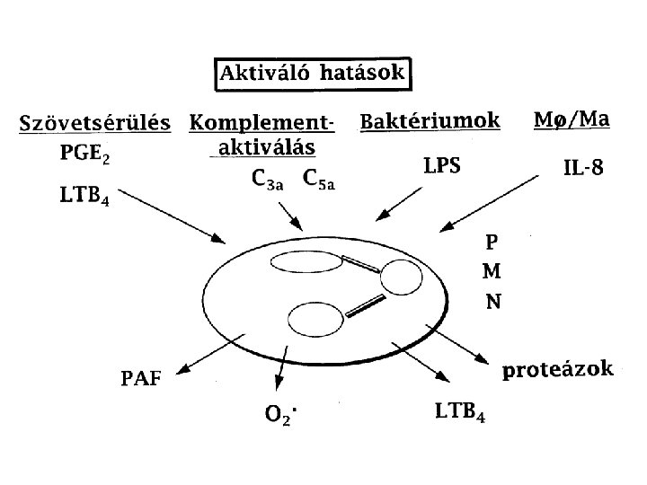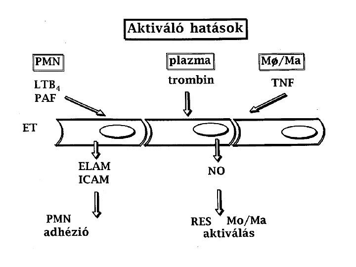 Elsődleges mediátorok aktiválják: mediátorok (NO, ONOO-) ROS lysosomális enzimek (mieloperoxidáz elastáz) szövetbe vándorolnak további aktiváció további mediátorok IL, TNF, PAF, stb. gyulladás aktiváció: parakrin, autokrin (lipid- és peptid-peroxidáció) - endothel sejtek - granulocyták