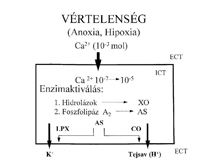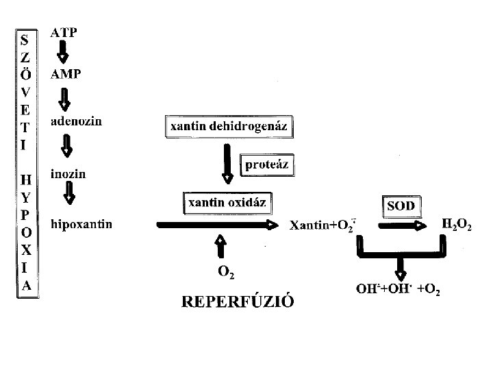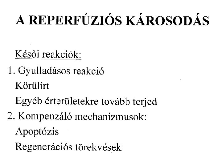 A reperfúziós károsodás Többlépcsős folyamat: 1. Súlyos hipoxia/anoxia következménye: szöveti sérülés (endothel sejtek, egyéb sejtek) 2. Kórai reperfúzió: No reflow (kapillárisok) Reflow paradox (posztkapilláris venula) 3. Késői reperfúzió: gyulladásos reakció