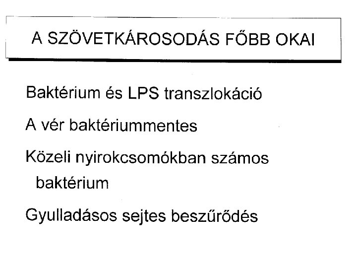 A bél mint sokk szerv direkt károsodás (perforáció, vérzés) epithelsejtek oxigénye nagy hipoxiás permeabilitás fokozódás bélbaktériumok vérbe, nyirokba jutnak, endotoxin (LPS)