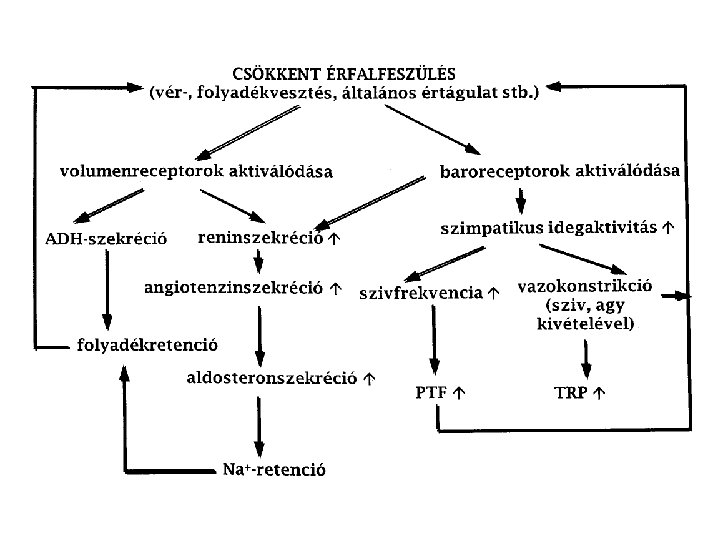 A vérkeringési rendszer reakciói Kompenzáló mechanizmusok: szívfrekvencia PTF BP 2 -receptorok anyagcsere folyamatok -receptorok vasokonstrikció (vese, hasi zsigerek, izom, zsír) Ang II direkt vazokonstrikció