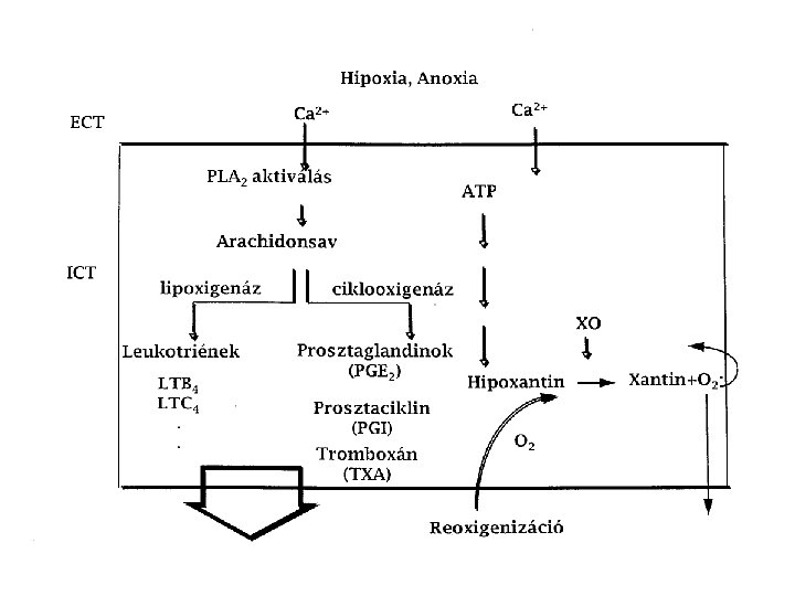 Membrán sérülés vérkeringési sokkban Ez mind sejtkárosodáshoz, membrán sérüléshez vezet. komplement rendszer aktiválódik foszfolipáz A 2 - AA - COX 1 és COX 2 - LTB 4, PGE 2, TXA 2, PGF 1 (elsődleges mediátorok)