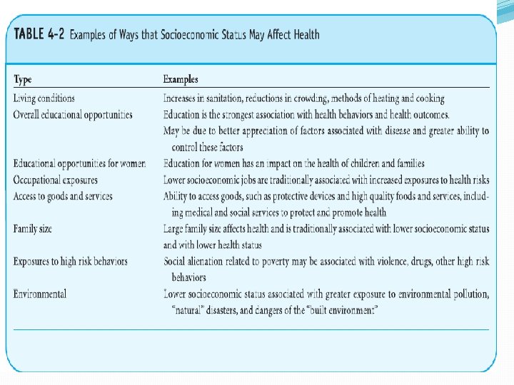 How Does Socioeconomic Status Affect Health? �Dimulai pada abad ke-19, para ilmuwan sosial mengembangkan konsep status sosial ekonomi. �Mereka juga mengembangkan secara rinci sistem untuk mengoperasionalkan definisi sosioekonomi status dan mengklasifikasikan individu. �Di Amerika Serikat, definisinya umumnya mencakup langkah-langkah yang terutama bersifat ekonomi termasuk: 1. pendapatan keluarga 2. tingkat pendidikan atau tingkat pendidikan orang tua 3. status profesional atau status profesional orang tua