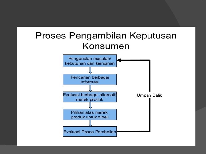 Proses Pengambilan Keputusan intern al Persepsi Motivasi Belajar Sikap Ekster nal Sub Budaya Kelas Sosial Kelompokkelompok Pemimpin / panutan Kepribadian Usia Gaya hidup Peran Gender Situasi onal Dekorasi Aroma Penerangan Temperatur ruangan