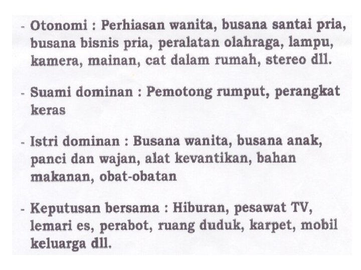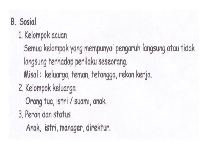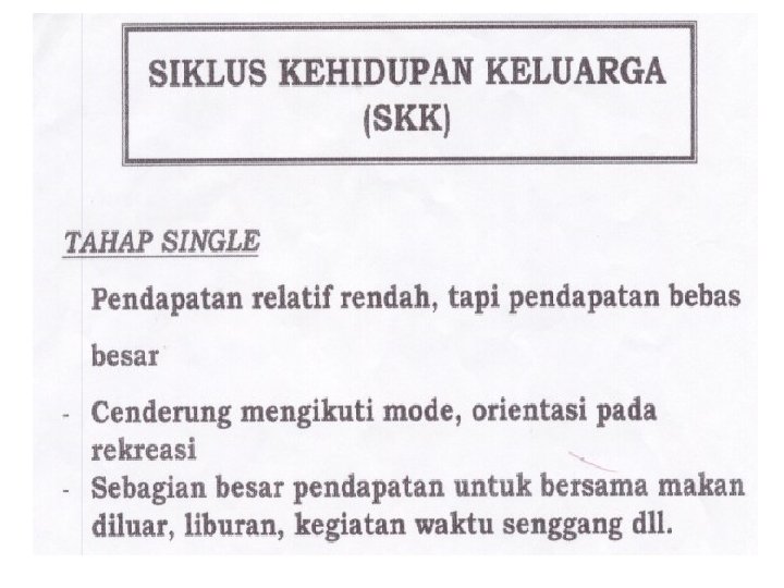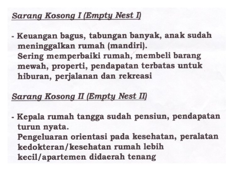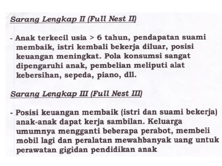 KONSUMEN KELUARGA 1. Keluarga (Family) : Kelompok yang terdiri dari 2 atau lebih orang yang berhubungan melalui darah, perkawinan atau adopsi dan tinggal bersama 2. Keluarga Inti (Nuclear Family) : Kelompok langsung yang terdiri dari ayah, ibu dan anak yang tinggal bersama 3. Keluarga Besar (Extended Family) : Keluarga inti ditambah kerabat lain seperti nenek, kakek, paman, bibi, sepupu dan kerabat karena perkawinan. 4. Rumah Tangga : Semua orang, baik kerabat maupun yang tidak yang menempati satu unit keluarga
