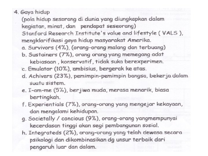 LANJUT USIA 1. Banyak pengalaman seolah-olah dia yang terpandai 2. Tidak mengikuti “Zaman” (kolot) 3. Tidak terburu-buru, senang berbincang 4. Umumnya bertindak lamban dalam membeli 5. Tenang, ramah, keibuan, kebapakan PERLAKUAN : 1. Banyak waktu untuk melayaninya, sabar 2. Dengarkan nasehat-nasehatnya 3. Beri nasehat yang kesannya dari orang tua 4. Hadapkan penjual yang agak lanjut usia