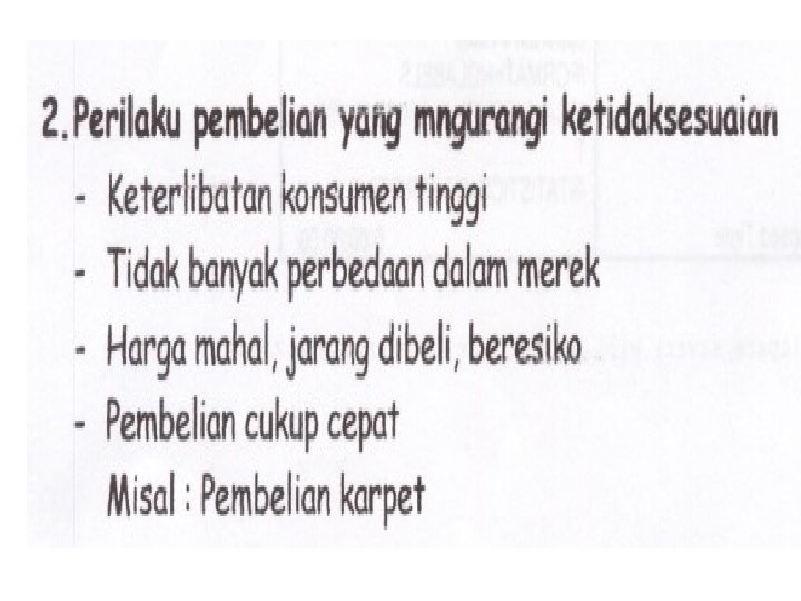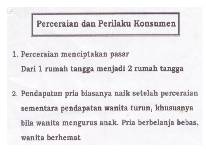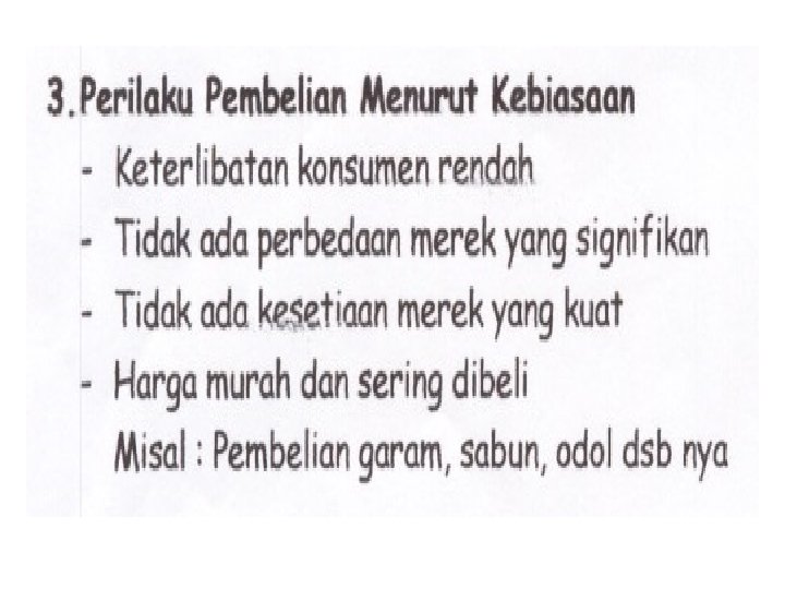PRIA 1. Mudah terpengaruh bujukan 2. Sering tertipu karena tidak sabaran 3. Ada perasaan tidak enak bila masuk toko 4. Kurang minat berbelanja shg mengambil keputusan membeli sering terburu-buru 5. Mudah dipengaruhi nasihat & argumentasi obyektif PERLAKUAN : 1. Dilayani dengan cepat tanpa banyak bicara 2. Beri penjelasan terbatas 3. Usahakan agar yang dibeli cocok 4. Jangan menunjukkan barang yang warnanya mencolok (barang mode)