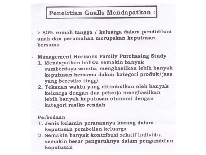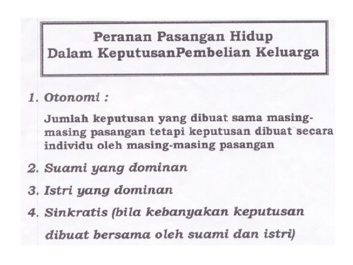 Peranan Individu Dalam Pembelian Keluarga 1. Penjaga Pintu (Gate Keeper) : Inisiator pemikiran keluarga mengenai pembelian produk dan pengumpulan informasi untuk membantu pengambilan keputusan. 2. Pemberi Pengaruh (Influencer) : Individu yang opininya dicari sehubungan dengan kriteria yang harus digunakan oleh keluarga dalam pembelian dan produk/merek mana yang paling mungkin cocok dengan kriteria evaluasi. 3. Pengambil Keputusan (Decider) : Orang dengan wewenang / kekuasaan keuangan untuk memilih bagaimana uang keluarga akan dibelanjakan, produk dan merek mana yang akan dipilih. 4. Pembeli (Buyer) : Orang yang bertindak sebagai agen penjualan seperti mengunjungi toko, menulis cek, membawa produk kerumah, dll. 5. Pemakai (User) : Orang yang menggunakan produk
