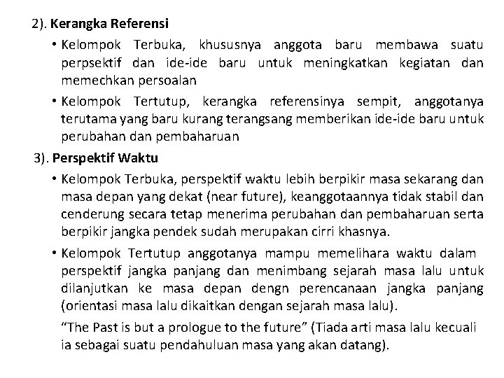 2). Kerangka Referensi • Kelompok Terbuka, khususnya anggota baru membawa suatu perpsektif dan ide-ide baru untuk meningkatkan kegiatan dan memechkan persoalan • Kelompok Tertutup, kerangka referensinya sempit, anggotanya terutama yang baru kurang terangsang memberikan ide-ide baru untuk perubahan dan pembaharuan 3). Perspektif Waktu • Kelompok Terbuka, perspektif waktu lebih berpikir masa sekarang dan masa depan yang dekat (near future), keanggotaannya tidak stabil dan cenderung secara tetap menerima perubahan dan pembaharuan serta berpikir jangka pendek sudah merupakan cirri khasnya. • Kelompok Tertutup anggotanya mampu memelihara waktu dalam perspektif jangka panjang dan menimbang sejarah masa lalu untuk dilanjutkan ke masa depan dengn perencanaan jangka panjang (orientasi masa lalu dikaitkan dengan sejarah masa lalu). “The Past is but a prologue to the future” (Tiada arti masa lalu kecuali ia sebagai suatu pendahuluan masa yang akan datang).