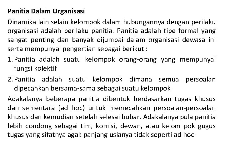 Panitia Dalam Organisasi Dinamika lain selain kelompok dalam hubungannya dengan perilaku organisasi adalah perilaku panitia. Panitia adalah tipe formal yang sangat penting dan banyak dijumpai dalam organisasi dewasa ini serta mempunyai pengertian sebagai berikut : 1. Panitia adalah suatu kelompok orang-orang yang mempunyai fungsi kolektif 2. Panitia adalah suatu kelompok dimana semua persoalan dipecahkan bersama-sama sebagai suatu kelompok Adakalanya beberapa panitia dibentuk berdasarkan tugas khusus dan sementara (ad hoc) untuk memecahkan persoalan-persoalan khusus dan kemudian setelah selesai bubar. Adakalanya pula panitia lebih condong sebagai tim, komisi, dewan, atau kelom pok gugus tugas yang sifatnya agak panjang usianya tidak seperti ad hoc.