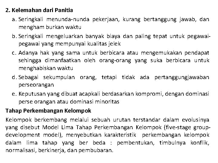 2. Kelemahan dari Panitia a. Seringkali menunda-nunda pekerjaan, kurang bertanggung jawab, dan mengham burkan waktu b. Seringkali mengeluarkan banyak biaya dan paling tepat untuk pegawai yang mempunyai kualitas jelek c. Adanya hak yang sama untuk berbicara atau mengemukakan pendapat sehingga dimanfaatkan oleh orang-orang yang suka berbicara untuk menghabiskan waktu d. Sebagai sekumpulan orang, tetapi tidak ada pertanggungjawaban perseorangan e. Keputusan yang dibuat acapkali berdasarkan kompromi, dengan dominasi perse orangan atau dominasi minoritas Tahap Perkembangan Kelompok berkembang melalui sebuah urutan terstandar dalam evolusinya yang disebut Model Lima Tahap Perkembangan Kelompok (five-stage groupdevelopment model), menyebutkan karakteristik perkembangan kelompok dalam lima tahap yang ber beda : pembentukan, timbulnya konflik, normalisasi, berkinerja, dan pembubaran.