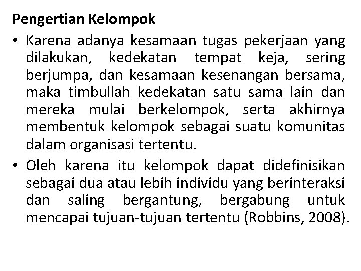 Pengertian Kelompok • Karena adanya kesamaan tugas pekerjaan yang dilakukan, kedekatan tempat keja, sering berjumpa, dan kesamaan kesenangan bersama, maka timbullah kedekatan satu sama lain dan mereka mulai berkelompok, serta akhirnya membentuk kelompok sebagai suatu komunitas dalam organisasi tertentu. • Oleh karena itu kelompok dapat didefinisikan sebagai dua atau lebih individu yang berinteraksi dan saling bergantung, bergabung untuk mencapai tujuan-tujuan tertentu (Robbins, 2008).