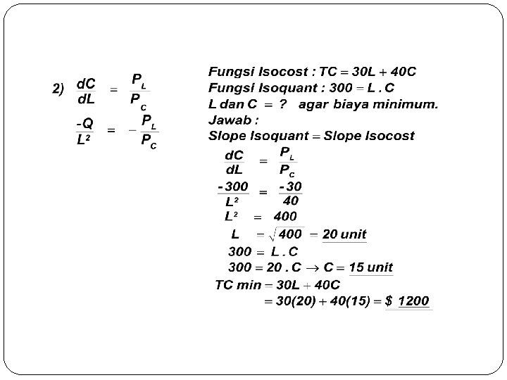 - Kondisi (Syarat) Optimasi 1) Kombinasi terletak di sepanjang garis isocost (semua dana dibelanjakan) 2) Kombinasi terletak tepat di persinggungan antara isocost dan isoquant yang semaksimal mungkin dapat dicapai (Q 2) atau Slope Isocost = Slope Isoquant Rasio harga input = MRTS PL/PC = (MPL/MPC atau d. C/d. L) Jadi kondisi keseimbangan produsen (Least Combination) dapat dihitung dengan cara : 1) MPL/ MPC = PL/ PC 2) d. C/d. L = PL/ PC