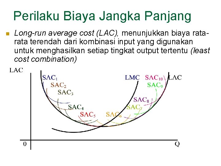 Perilaku Biaya Jangka Panjang n Long-run average cost (LAC), menunjukkan biaya rata terendah dari kombinasi input yang digunakan untuk menghasilkan setiap tingkat output tertentu (least combination)