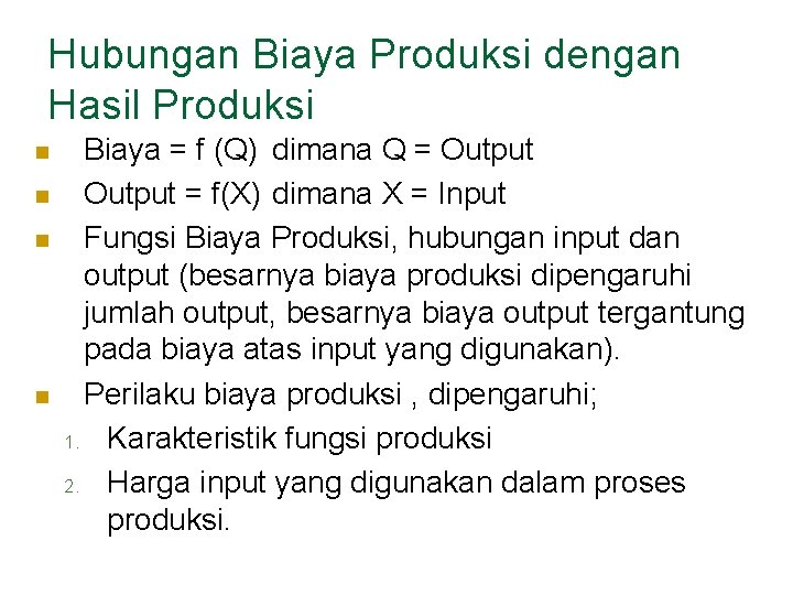 Hubungan Biaya Produksi dengan Hasil Produksi n n Biaya = f (Q) dimana Q = Output = f(X) dimana X = Input Fungsi Biaya Produksi, hubungan input dan output (besarnya biaya produksi dipengaruhi jumlah output, besarnya biaya output tergantung pada biaya atas input yang digunakan). Perilaku biaya produksi , dipengaruhi; 1. Karakteristik fungsi produksi 2. Harga input yang digunakan dalam proses produksi.