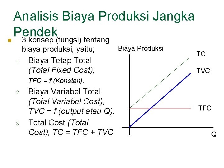n Analisis Biaya Produksi Jangka Pendek 3 konsep (fungsi) tentang biaya produksi, yaitu; 1. Biaya Tetap Total (Total Fixed Cost), Biaya Produksi TC TVC TFC = f (Konstan). 2. 3. Biaya Variabel Total (Total Variabel Cost), TVC = f (output atau Q). Total Cost (Total Cost), TC = TFC + TVC TFC Q
