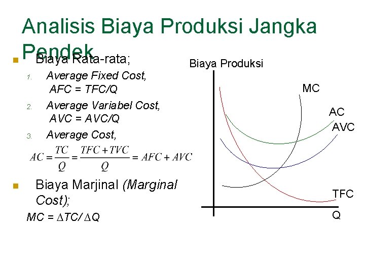 Analisis Biaya Produksi Jangka n Pendek Biaya Rata-rata; Biaya Produksi 1. 2. 3. n Average Fixed Cost, AFC = TFC/Q Average Variabel Cost, AVC = AVC/Q Average Cost, Biaya Marjinal (Marginal Cost); MC = ∆TC/ ∆Q MC AC AVC TFC Q