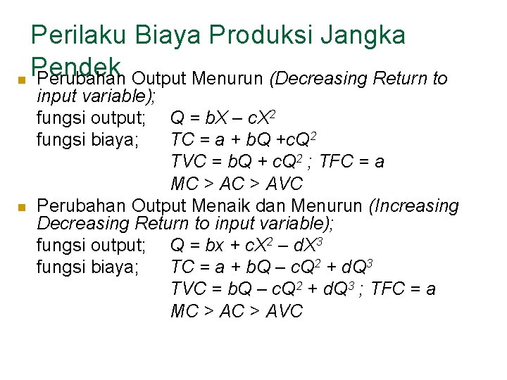 Perilaku Biaya Produksi Jangka Pendek n Perubahan Output Menurun (Decreasing Return to n input variable); fungsi output; Q = b. X – c. X 2 fungsi biaya; TC = a + b. Q +c. Q 2 TVC = b. Q + c. Q 2 ; TFC = a MC > AVC Perubahan Output Menaik dan Menurun (Increasing Decreasing Return to input variable); fungsi output; Q = bx + c. X 2 – d. X 3 fungsi biaya; TC = a + b. Q – c. Q 2 + d. Q 3 TVC = b. Q – c. Q 2 + d. Q 3 ; TFC = a MC > AVC