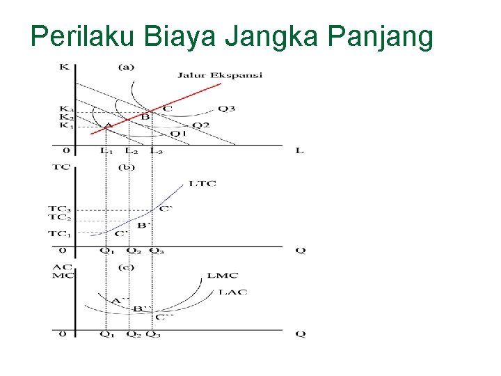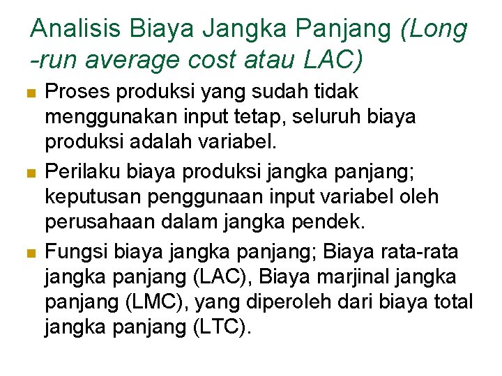 Analisis Biaya Jangka Panjang (Long -run average cost atau LAC) n n n Proses produksi yang sudah tidak menggunakan input tetap, seluruh biaya produksi adalah variabel. Perilaku biaya produksi jangka panjang; keputusan penggunaan input variabel oleh perusahaan dalam jangka pendek. Fungsi biaya jangka panjang; Biaya rata-rata jangka panjang (LAC), Biaya marjinal jangka panjang (LMC), yang diperoleh dari biaya total jangka panjang (LTC).