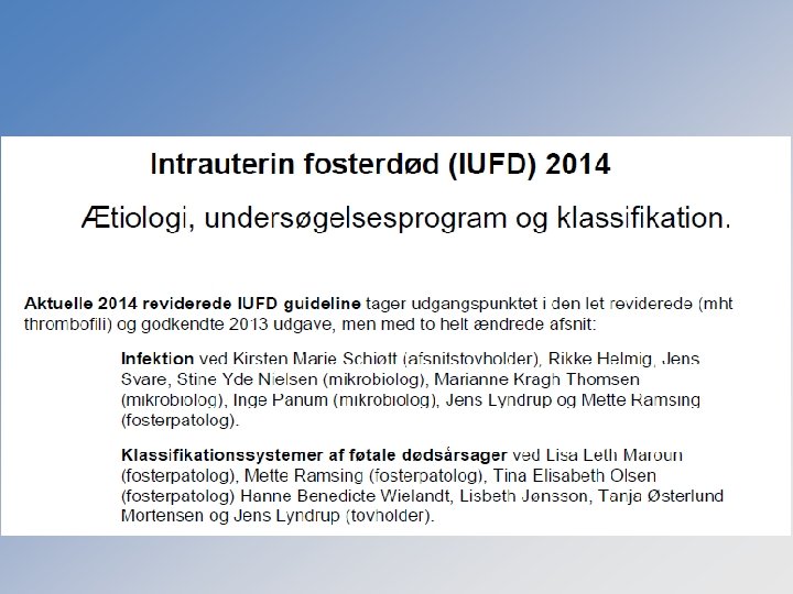 IUFD 2014: IUFD 2013 gruppe + Infektiongruppe : Kirsten Marie Schiøtt (gruppetovholder), Rikke Helmig, Jens Svare, Stine Yde Nielsen, Marianne Kragh Thomsen, Inge Panum , Jens Lyndrup og Mette Ramsing og Klassifikationsgruppe: Lisa Leth Maroun, Mette Ramsing , Tina Elisabeth Olsen, Hanne Wielandt, Lisbeth Jønsson, Tanja Østerlund Mortensen og Jens Lyndrup (tovholder). Infektion: • Dyrkning / PCR henholdsvis • rutine / flowchart Klassifikation af dødsårsager • • Valg af system Kontakt til INCODES amerikanske fædre Oversættelse til et dansk INCODE-DK 2014 Perinatal INCODE-DK audittabel
