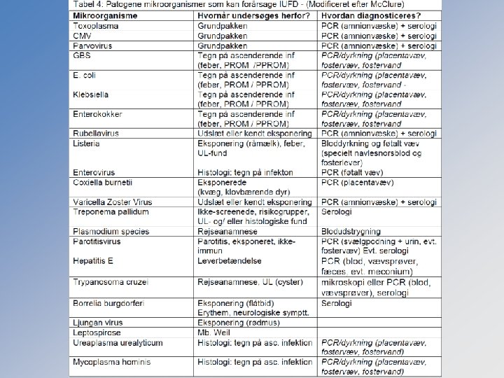 Grundpakke: Amniocentese 2 sterile spidsglas á 20 ml: PCR (Toxopl. , Parvo, CMV, ) D+R - hvis ikke AC, da serologi Fosterblodprøve Navlesnorsblod, analyseres kun på indikation Maternelle symptomer: Feber: ØUrin til D+R ØBloddyrkning Udslæt: ØRubella: PCR(amnion) (/serologi) ØVaricella: PCR(amnion) (/serologi) PROM/PPROM): ØCervix/vaginal-podning ØPlacentaprøve til D+R Maternel eksponering: Erhverv (kvæg, dyrlæger) ØPlacentarvæv (2 x 2 cm i spidsglas m saltvand) til PCR for Coxiella Burnetii (Q-feber) Rejser: ØMalariaudstrygning Uscreenede: ØHepatitisserologi ØSyfilisserologi Kendt specifik eksponering: ØRelevant udredning (f. eks. Rubella-PCR + -serologi) Fødevarer (upasteuriserede mælkeprodukter) ØBloddyrkning (Listeria) Parakliniske fund: Føtalmediciner: Polyhydramnios Ø Hydrops Ø Cyster i hjernen Ø Forkalkninger Ø Patolog: (Se bilag s. 42)