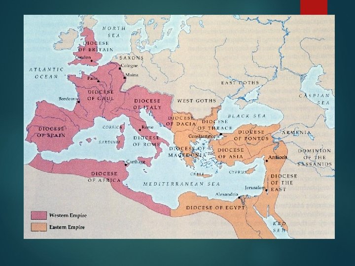 A Divided Empire � � 180 CE – the peak of Pax Romana under Marcus Aurelius Beginning with Commodus’s reign, the empire began to fail To large to manage as a whole Diocletian divided empire to ease management � 284 � � Constantine moved capital to Byzantium Theodosius made split permanent