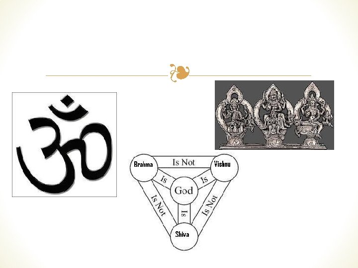 Hinduism ❧ ❧ Early on, beliefs passed through oral tradition ❧ Later recorded in sacred texts, including the Vedas and the Upanishads ❧ Hinduism Teaches that there are many manifestations of the Great Soul of the Universe (Brahman)(a trinity= trimurti) ❧ Hindus believe themselves to be Monotheistic ❧ Westerners believe them to be Polytheistic