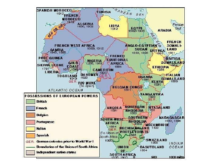 IV. Berlin West Africa Conference 1884 -5 Divides Africa 1. Convened by Germany’s Bismarck to set rules for annexing African territory Purpose: to prevent war amongst Europeans 14 Eur. nations attended; no African rulers present Outcome: annexation of African terr. only recognized when “effective occupation” demonstrated By 1914 only Liberia & Ethiopia remained independent 2. 3. 4. 5. – 6. Battle of Adwa, 1896 Conference successful in avoiding Eur. War with 1 major exception: South Africa