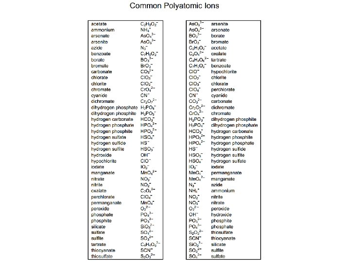 9 polyatomic ions I should know Name Formula Charge Acetate C 2 H 3 O 2 - Ammonium NH 4 + Cyanide CN - Hydroxide OH - Nitrate NO 3 - Nitrite NO 2 - Phosphate PO 4 3 - Sulfate SO 4 2 - Sulfite SO 3 2 -