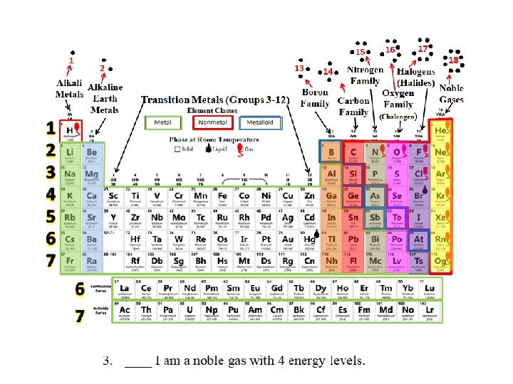 The rows in the table make up PERIODS. Label each ROW with the number of energy levels (circles) it has. Alkaline Metals Earth Metals 1 2 3 4 5 6 7 Transition Metals (Groups 3 -12) Halogens Nitrogen (Halides) Family Noble Boron Gases Oxygen Carbon Family (Chalcogen) 6 1 P STE