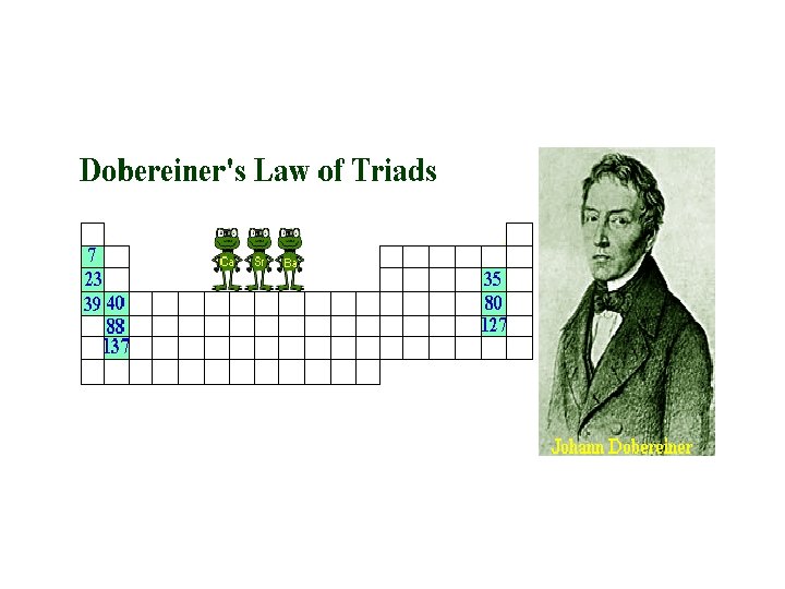 Dobereiner’s Law of Triads • A triad is a group of three elements • with similar chemical properties in which • the atomic mass of the middle element is approximately equal to the average of the other two. • Only worked for very few elements of the 50 or so that were known at the time • BUT • He was first to make a link between atomic weight and properties