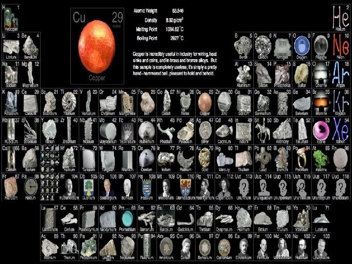 Metals Nonmetals Metalloids • Shiny • Malleable • Ductile • Good conductors of heat and electricity • Most are solid at room temperature • Mostly dull • Brittle • Poor conductors of heat and electricity • Many are gases at room temperature • Varying ability to conduct electricity • Can be used to make semiconductors (materials that conduct electricity only under certain conditions)