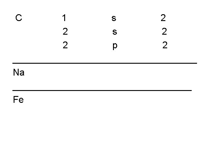 • • • H (1) 1 s 1 He (2) 1 s 2 Li (3) 1 s 1 2 s 2 C ( 6) 1 s 1 2 s 2 2 p 2 Na (11) 1 s 1 2 s 2 2 p 6 3 s 1 Al (13) Fe(26) Ga(31) Ag (47) Nd (60)