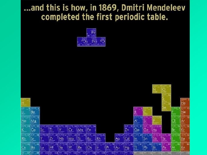 Dmitri Mendeleev • • • created version in 1869, revised version in 1872 first attempt to organize elements into a logical format arranged elements by increasing atomic mass spaces left for missing elements attempted to keep elements together by similar chemical properties as well • these two ideas could not both be followed correctly at the same time