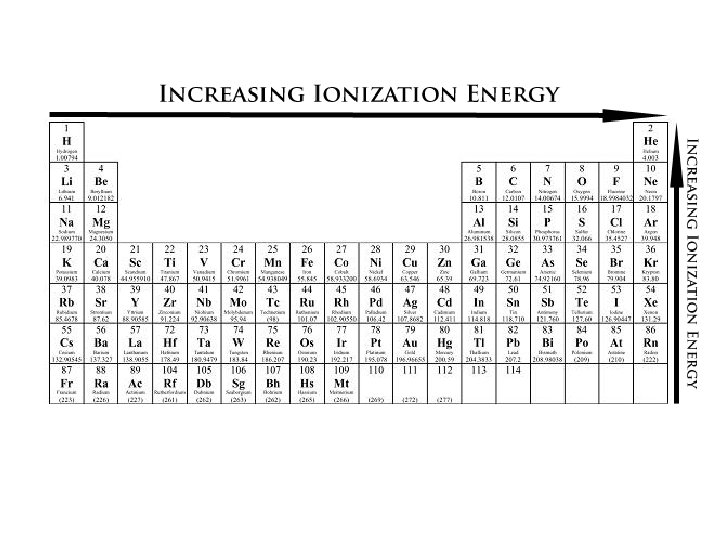 Trend within Periods -increases moving from L R - Just like atomic radius, As we look from left to right the positive charge in the nucleus increases which increases the attraction between the protons and electrons - Therefore, it takes more energy to pry them away Not as strong of a pull, so it is easier to pull one away 13 pulling tighter 17 pulling tighter