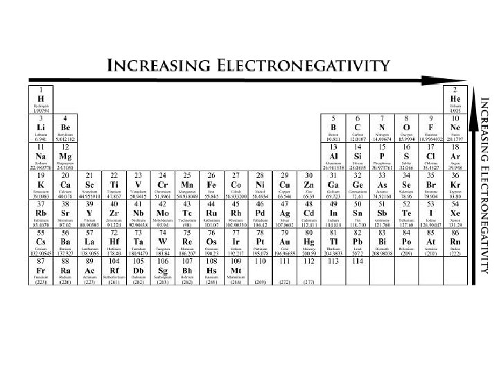3. Electronegativity: is an atoms ability to attract the electrons of another atom to it Trend Within Periods -increases when moving left to right - this is because as we move to the right of the periodic table, the atoms ability to attract electrons becomes stronger as they become closer to a full octet Boron still needs 5 e- to have a full octet Flourine only needs 1 e- to have a full octet
